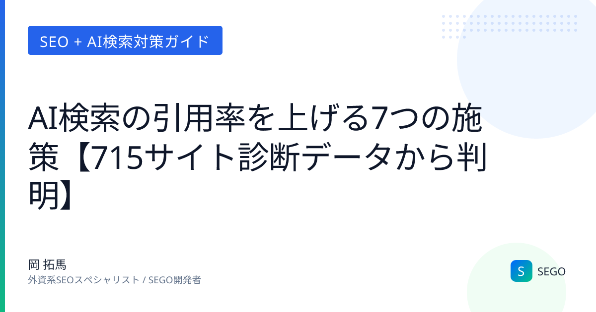 本記事では、SEGO診断ツールで715サイトを分析した結果から判明した「引用される/されないサイトの決定的な差」と、引用率を上げる7つの具体的な施策を体系的に解説します。
