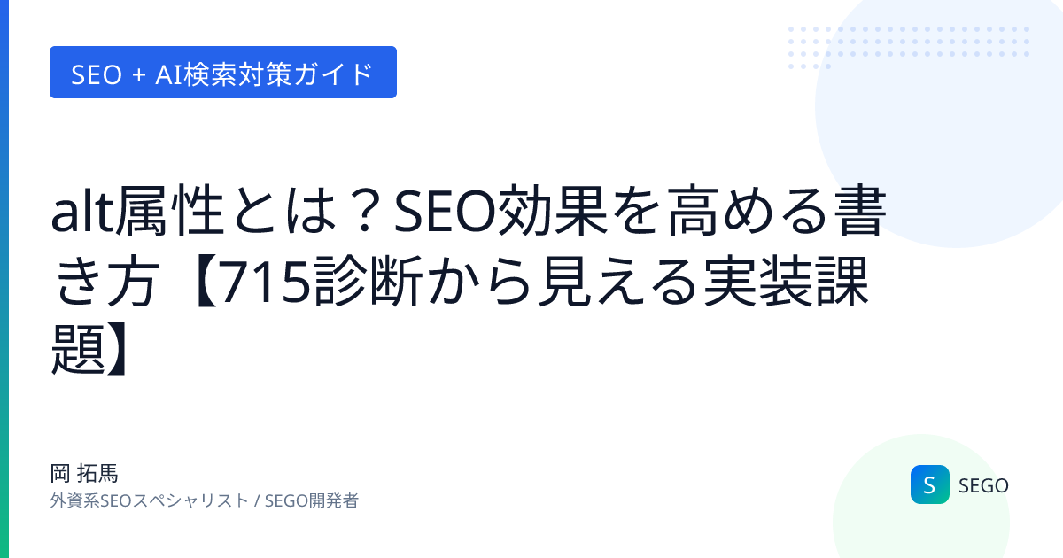 本記事では、alt属性の基本から、SEGO診断715サイトで判明した実装課題、画像タイプ別の正しい書き方までを解説します。