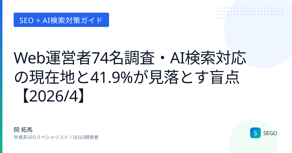 本記事では、調査の全データを透明性をもって公開します。回答者属性・AI検索対応の実態・SEGO診断ツールへの評価・改善要望TOP3まで、有利な数値だけを抜粋することなく開示します。